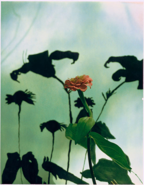 Lichtenstein’s new series of Polaroids reminds us that beauty and understanding can indeed coexist and, in fact, often produce each other. In her work—as in the early photographic experiments of William Henry Fox Talbot, who thought that capturing a landscape’s imprint on paper would be a charming alternative to sketching it; or in Eadweard Muybridge’s famous animal locomotion photos, which unraveled age-old mysteries of life’s form; or even in the elegantly specific illustrations of John James Audubon, which captured particulars of native species in intricate detail—the replication of nature, and the desire to do so, is not simply a tool to further humankind’s progress or to achieve artistic realism, but is a thing of transcendence. Take, for instance, Lichtenstein’s Untitled #8 (flower) (2005). A single pink flower atop a bent green stalk, an ordinary sort of thing, stands before a shadowy backdrop of flowers past and future. In itself, this little being epitomizes the futility and grace of life, the dendritic patterns of its leaves representing all of us and, captured here in a glint of light, keeping forever safe the delicate thing’s impermanence. Behind the flower, black figures loom against watery greens and blues, a backdrop that resembles a pond reflecting the evening sky. The dark silhouettes suggest infinite flowerness. Their distinctions are an obvious product of Darwinian speciation, and yet the looming quality they share conveys something otherworldly. Between the unimposing pink blossom that one might have picked up on the side of the road and the more universal gestures of flowers behind it is a space where the flower and the idea of the flower merge. Here is where knowledge and imagination grow into each other in an indistinguishable thicket and the viewer, experienced as she is in separating fact from fiction, is encouraged to let such differences drift away into a dusky mist.