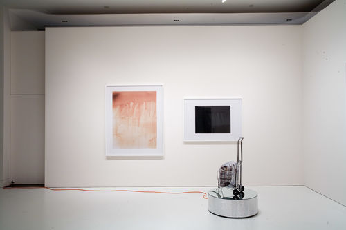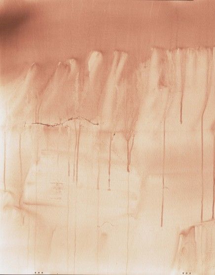 Beshty's installation acts as a portal to the mission and includes a brutalized bag of embassy ephemera that bears the marks of an inspection by the U.S. Department of Homeland Security; waiting room furniture; reading material; and a telephone line that connects museum visitors to a phone at the mission in Berlin. The image of the mission's facade is a composite of two photographs, one spanning the transition from night into day, the other from day into night; other photographs record the impressions of books left after a recent fire. The larger works document the scars on Beshty's camera film left by airport x-ray machines and security checkpoints in its movement across international borders. Their vaporous discolorations add an unexpected beauty to the office debris.