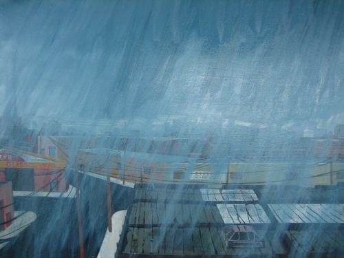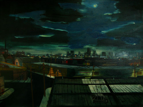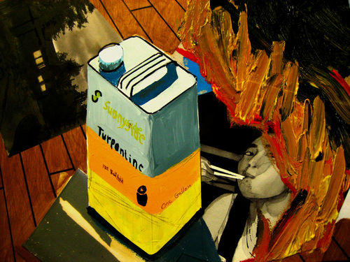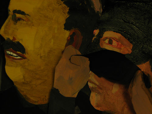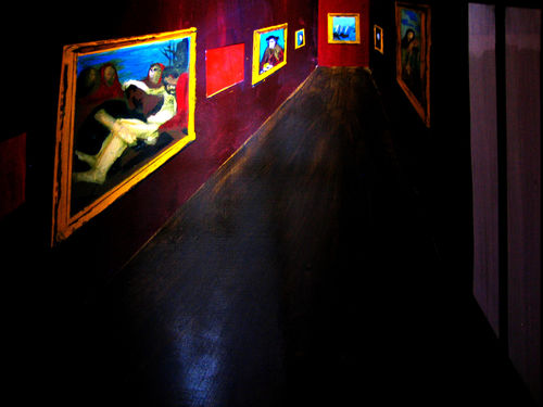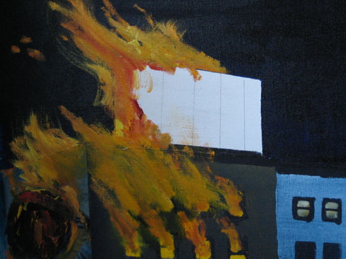 Ezra Johnson's new animated low-tech digital film, What Visions Burn (2006), uses lushly colored paintings and collaged figures to tell the story of a pair of art thieves in New York City. The animation is a laborious process, as Johnson paints and repaints the surface of his canvases to create each frame of the film, which uses visual elements and sound effects to narrate the scenario. Johnson's amusing depictions of the art world's many characters and his poetic representations of the city tell a story both romantic and unexpected.