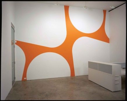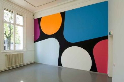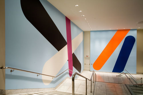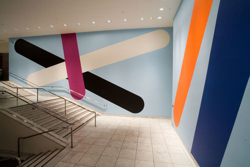 Jan van der Ploeg first began painting his geometric designs on the walls of buildings in his native Amsterdam. Since then, he has painted his motifs in hundreds of permutations at galleries and institutions all over the world. Using different combinations of common shapes, bold colors, and shifts in scale, his wall paintings invite viewers to experience spaces in new and dynamic ways. Van der Ploeg’s large-scale painting for the Hammer, installed in the Museum’s Lobby, considers the specific architecture of the space, adding new depth and dimension to a familiar place.