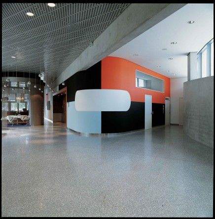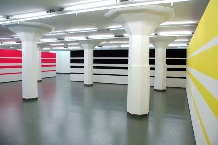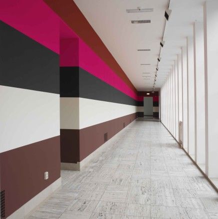 Walls, facades, stairwells, and lobbies are the supports for Van der Ploeg’s paintings. Recently his works appear to have taken on an almost cartoonesque or caricature-like quality, as if the painter has shed his relative modesty. He has painted all the walls of a classical interior in the Charlottenborg Exhibition Hall in Copenhagen with an oversize brick pattern, producing a work that in a certain sense has a figurative effect and makes a direct comment on the surrounding space. Van der Ploeg’s wall paintings have the ability to give structure and to create a completely novel spatial awareness. By stacking five colored stripes one above the other in a long, narrow corridor in the Museum Boijmans Van Beuningen in Rotterdam, he managed to evoke a thoroughly new sense of space among the museum’s visitors. This wall painting also had something of the cartoonesque; indeed the stacking of the specific colors quickly earned the work the nickname “Licorice Allsorts.” And the proposal for the Hammer Museum also has, as mentioned earlier, a figurative, almost humane quality.