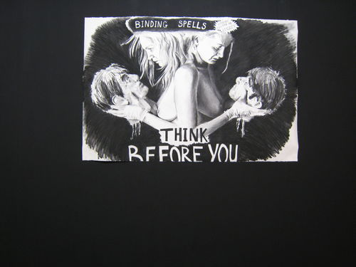 She began to diagram the bits and pieces in an attempt to understand what she had discovered. “I am more him than he is.” “Becoming: What do you need me to be?” “Information is power.” “Control.” “Trespass.” “What’s yours is Mine.” “Groom-by-Capture Cycle.” Among her ramblings and notes and questions and theories she filled huge sheets of paper with pencil drawings of him and her.