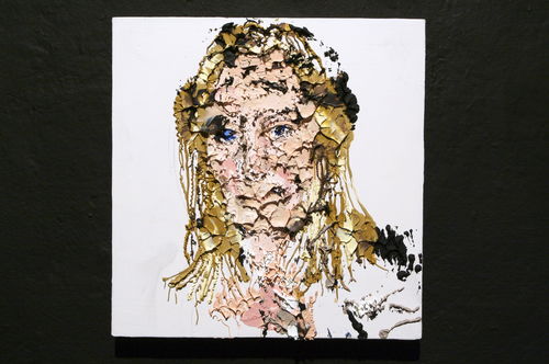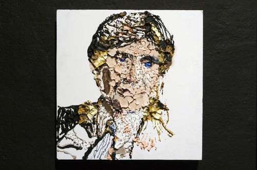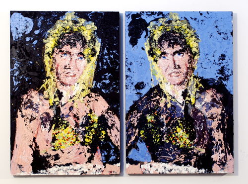 In the beginning she relied heavily on the Internet and was able to gain access to a lot of information quite easily and legally. Then she moved on to a more intuitive approach: she had his handwriting analyzed and got his-and-her astrological charts. She painted a portrait of him, and while it was still wet, smashed it face-to-face with her own self-portrait. Their faces literally merge in these “kiss” paintings. She carefully studied the photos and facts and painted incredibly small, almost fetishized compositions of snapshots and found documents. She then photographed these miniature paintings at the highest resolution possible (the size used for fingerprint analysis) and blew them up so that they operate as forensic documents revealing fingerprints, hairs from the paintbrush (and from the artist), and pieces of lint and dust. But all these traces are from the artist, and the enlarged images only took him more out of focus. Here she began to collapse her own identity into his as her physical evidence superseded clues about him.