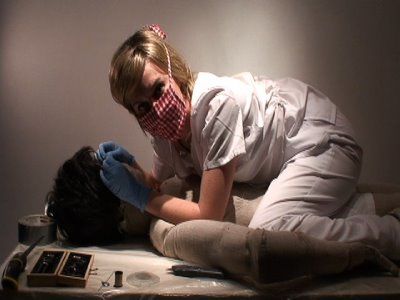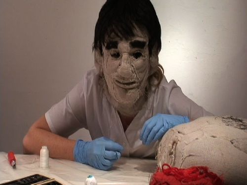In the video Upson appears to be somewhat maniacal yet matter-of-fact, like a QVC jewelry saleswoman rambling on and on to fill up air time and sell her wares. She wears makeshift white surgical scrubs. The Larry dummy lies on the table with a sewing kit next to his still head. She puts on her blue surgical gloves and begins to speak while patting his head and straightening his hair. Her surgical mask is homemade out of red gingham. “I’ve absolutely never met him,” she says, setting her hands on his chest lightly and then beginning to unbutton his shirt. She continues to recite facts and statements about how she came to know this mystery man, all the while prepping him for surgery. She repeats herself and continues the story as she threads a needle. His shirt is off, and she stitches his lips together. Her ramblings continue, and she begins to cut into his neck. Still telling the story, she starts to tug at his neck intensely. Occasionally she takes breaks, still talking, and affectionately touches him or tidies up his hair. Eventually she comes to straddle his body (he’s still wearing his pants), and after some tugging and awkward maneuvering, she decapitates him. In a final gesture illustrating their merging, she slips his head over her own and stares quietly into the camera.