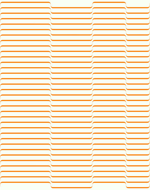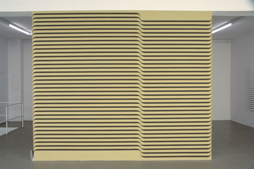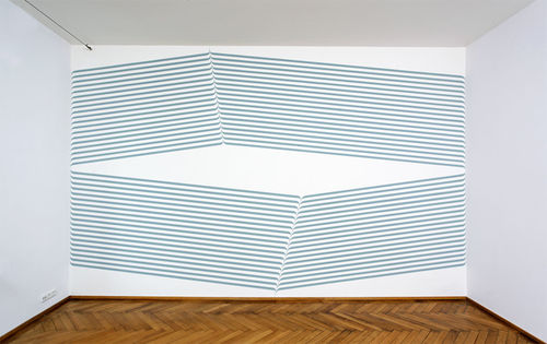 Considered and viewed from the edges, these sequences of horizontal stripes seem like layered and apparently three-dimensional planes of color stacked one behind the other. This impression is also conveyed when the lines are bent at the center of the composition, leading the gaze along a symmetrical axis as if the viewer were suddenly to be drawn behind the image. In a curious way, these works by Haggerty combine the tradition of Minimalist painting with the artistic principles and various interpretations of a form of expression that went before it—Op Art, a movement developed in the late 1950s and early 1960s that involved the use of perceptual phenomena as a creative tool. There is, however, an inherent contradiction in the aims of these two artistic trends, which are in fact divergent: nonobjective painting sought to create a spiritual space that extended beyond the boundaries of the artwork, whereas the aim of optical abstraction was to activate the phenomena of a created picture surface in order to produce specific effects within the boundaries of the image. The synthesis sought by Haggerty in his works can therefore be understood as a reduction and modified application of the formal means and possibilities offered to him by his art historical predecessors. His experience of the discipline of painting is first and foremost as a practice through which it is possible to investigate and explore the effects of planar surface and spatial illusion, of cool and warm color combinations.