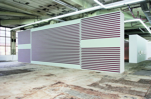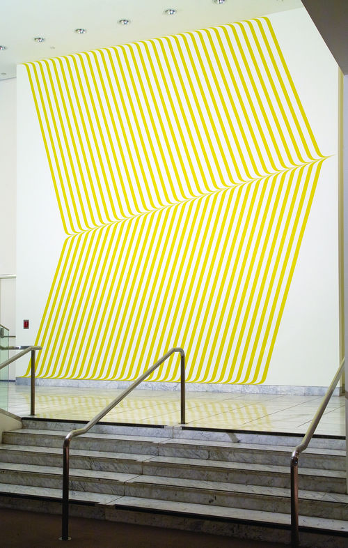 It is only recently that Haggerty has had the opportunity to realize his pictorial designs in the much larger format of wall-filling paintings. In this context, the installation he has developed for the foyer of the Hammer Museum in Los Angeles is his most extensive work to date. When motifs that have previously been depicted by Haggerty in a number of different painted works of varying formats are transferred onto a surface that—as in the case of the entrance hall of the Hammer Museum—involves two walls at right angles to each other, three-dimensionality becomes an increasingly important aspect. Suddenly this third dimension is no longer only an illusion within the painting but also a spatial reality in the place where the work is installed. The composition of this wall-based work, with its almost monumental depiction of a progression of colored lines, prompts spectators to constantly redefine their position in relation to the image by changing their viewing angle. When applied to the space of an installation, the illusion—which in Haggerty’s previous works was contained within the relatively narrow confines of a classical panel painting—develops into a challenging game of optical deception that is produced and destroyed at once. The bending of the lines at the edges is now no longer merely a perceptual illusion; it occurs over the entire distance covered by viewers as they climb the stairs leading up to the exhibition space and pass by the wall work. This constantly changing perspective makes it seem as if the real wall of the architectural structure is curving; it becomes light and immaterial behind Haggerty’s pictorial foil. The composition, which is clearly site-specific, expands to include a suggestion of “space-specificity,” such is the pull of the visual stimulus that draws viewers in and involves them in a tense confrontation between perceived optical phenomena and actual bodily experience within the space.
