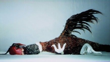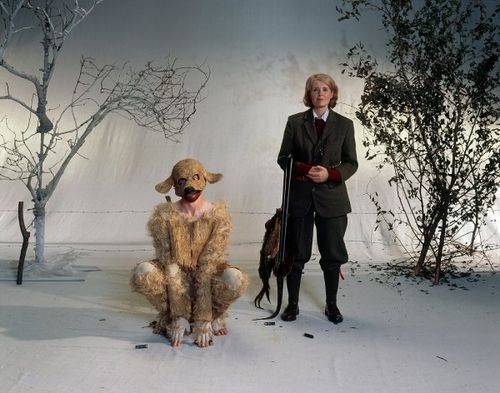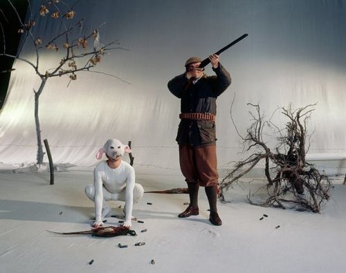 In Laddy and the Lady (2005), a twelve-minute film that Coombes wrote and directed, the hard, corporeal world of blood sport is intensified by the iniquity and competitiveness of class hierarchies. Here the prey goes from beast to fowl, as two hunters—one male (and, judging from his accent, presumably of peasant stock) and the other an aristocratic woman of Scottish landed gentry (the “Lady”)—wait with their dogs (played by actors in dog costumes) as men beat the bushes to drive out pheasants or grouse for the sport of shooting. Laddy, the lady’s golden retriever, is not good at taking commands and mirrors his mistress’s anxious and abusive behavior by being equally badly behaved and high-strung. The calm and respectful demeanor of Quentin (the other hunter) and his obedient spaniel, Jack, contrasts with the cycle of abuse and servitude between Laddy and the Lady. But one should not forget that, even with restraints, Laddy has been privileged since birth with creature comforts and rewards, having been born with a pedigree. In a flashback that presumably takes place in the mistress’s manor, Laddy the pup greedily and audibly suckles his mother’s teat—it is a Matthew Barneyesque moment, highly art-directed, with milk gushing everywhere.2 Returning to the now, and despite his ill treatment from the Lady, Laddy does succeed in retrieving the shot bird before Jack and is affectionately rewarded. The only true attempt at pathos is the wounded and dying pheasant (a play on peasant?), also played by a man in a costume, which suggests the moral dimension of a Landseer painting but without the sentimentality.