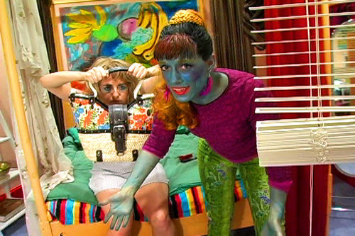 The I-Be we follow is actually I-Be II, cloned from I-Be the original and played by Trecartin. As a clone, I-Be II is a blank slate. He is able to assume fully formed identities discarded by others but not to cultivate one inherently his own. Shunned by his clone-intolerant family group, I-Be II begins his odyssey by abandoning “I-Be” for a New Ohio girl named Oliver and renaming him/herself “Amerisha.” Each time he sheds a worn self for a new one, I-Be II lurches toward identity autonomy by asserting his own history through revisions to those handed down to him. Molding time and its living artifacts is a poetic as well as structural theme of I-BE AREA, and the key to tracing the trajectory of the characters and plot, which, otherwise lost, still soar above linear comprehension.