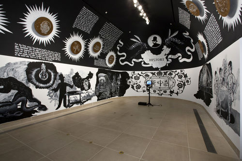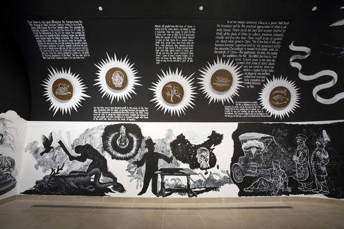 Sun Xun, a Chinese artist born in 1980 and living in Hangzhou, creates animations that combine hand-drawn renderings and traditional materials with new media. He studied printmaking at the China Academy of Fine Arts, but a burgeoning interest in moving images led him to found his own animation studio in 2006. To create his meticulous animations, Sun Xun produces a multitude of drawings that incorporate text within the image. His subjects range from elements found in world history and politics, to natural organisms. He then films the drawings, sequentially one at a time, to create a sense of movement and suggest the passing of time, the machinations of history, and the beauty inherent in simple forms. For over a week, Sun Xun inhabited the Vault Gallery to develop a new animated, site-related video and drawing installation.