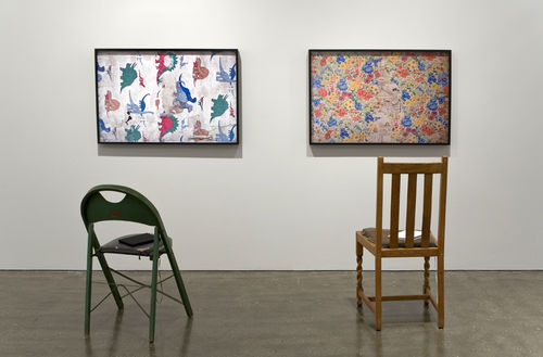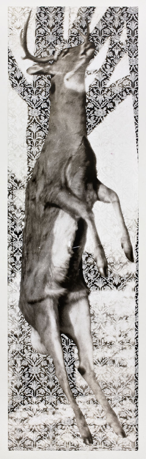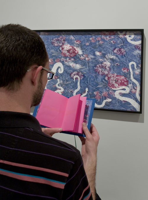 Jarring juxtapositions and stark imbalances are apparent in much of Russell’s work: the photographic images and his treatment of their surfaces, his choice of framing materials and furnishings for the gallery, his digital mimicry of Arts and Crafts movement progenitor William Morris’s Trellis wallpaper (the first chapter of Budget Decadence), and his hybrid artist books/zines (each containing subsequent chapters of the novella). Nevertheless, the seemingly disparate aesthetic elements of the installation are in fact deliberately chosen and constructed as reiterations of themes in the text.