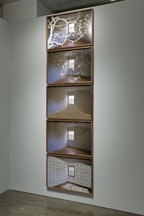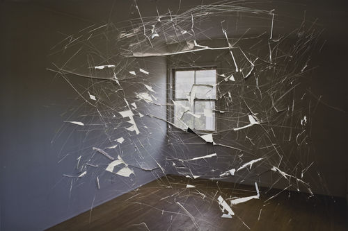 Christopher Russell creates “ripe ruins.”2 His artworks can be seen as portraits in absentia: of individuals and families who’ve fallen through the cracks, and of their ailing environments. “I photograph the physical margins of the social pact,” he has said, “the edges of town, spaces that have been . . . abandoned.”3 Employing “intermingled layers of narrative and images,”4 and materials such as floral fabrics, glitter, dirt, and hacked and scratched photographs, Russell gives us sun-bleached, ripped, splattered, graffitied, murky, erotic, sullied, elegant evidence of resilience and destruction.