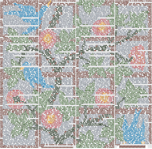 Russell, then, is chronicler, generator, and embellisher, distanced conduit of suppressed or lost narratives. He gains omniscient admittance to his subjects’ dwellings and consciousness via an admixture of acute observation and fictionalizing. He moves beyond facades and street scenes that his artist forebears documented, slipping indoors, sliding inside his characters/inhabitants through use of the interplay between visual and written images. Writer Italo Calvino, in an essay titled “Visibility,” observes, “We may distinguish between two types of imaginative process: the one that starts with the word and arrives at the visual image, and the one that starts with the visual image and arrives at its verbal expression.”9 Russell’s piece at the Hammer, it seems to me, is situated where those two types of imagination interact. Indoors and outdoors encroach on each other’s territory in this work, as nature moves to repossess what we’ve tried to wall off, to safeguard from her ravenous advances our fragile stabs at being “family,” our failed attempts to be tidy, loving, unified, civilized. Inside and outside, what we wanted to protect and what we wished to be protected from begin to leak together. They start to overwrite or colonize each other: “Thus the two spaces of inside and outside exchange their dizziness. . . . Outside and inside are both intimate—they are always ready to be reversed, to exchange their hostility.”10 In the process, some of the hidden is revealed, or at least partly exposed to our nosy gaze.