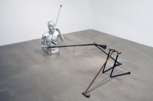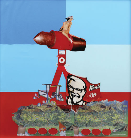 In his work Well Done (2001), for example, the artist takes the iconic Nike swoosh and Jacques-Louis David’s Death of Marat (1793) and intertwines the two completely disparate images to form an entirely new visual. Hess reminds us that there is no reprieve from the global marketplace, yet he also imbues the familiar corporate logos and historical images with his own personal history. For example, Jean-Paul Marat, like Hess, was a Swiss-born intellectual and writer at a time of great political and economic turmoil. Hess too is concerned with politics and the economy, but he deploys a certain postmodern sensibility that blatantly acknowledges that there is no black and white in our current political sphere (and perhaps there never was); furthermore, Well Done was made at the time of the second American-led invasion of Iraq. So unlike Marat’s unyielding political theories and ideals, Hess’s art (as text) is politically ambivalent and open-ended, visualizing, for better or worse, our current political and economic climate.