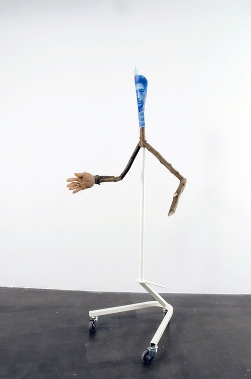 In his drawing-installation for the Hammer, Hess is literally playing a game of chutes and ladders (the board game influenced the artist’s designs for the installation), sliding, climbing, and looping, movements that tie back to his constant recycling of images. One particular image of a crawling baby exemplifies his investment in the “multiplicity of futurity,” the idea that positions and meanings are always to come. As in all of Hess’s works, there is no stable or singular horizon line. The baby has two heads that are facing in opposite directions—in a simultaneous dorsal movement. It crawls/walks, traveling much like the (dis)continuous lines that make up Hess’s artwork. This image, placed in close proximity to the text “pour l’avenir” (for the future), illustrates the unknown potentialities and possibilities of the fractured subject and the future.