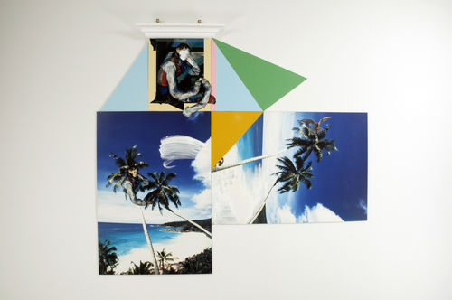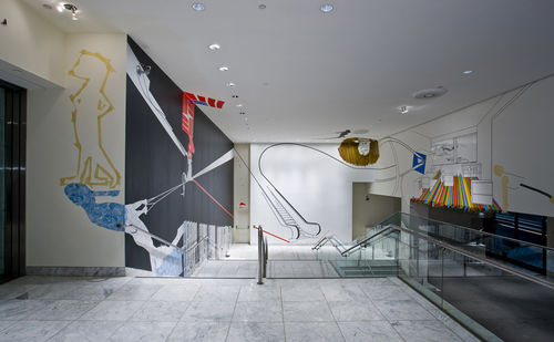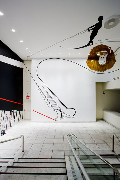 Swiss artist Nic Hess is known for his inventive wall works composed almost entirely of masking tape. Like a master graffiti artist, he turns everyday imagery into bold graphics often borrowing logos from corporations such as Chrysler, AT&T, Nike and even Mary Long cigarettes. Mixing drawing, bright colors and icons from a variety of sources, Hess makes us reevaluate our understanding of familiar signs in consumer culture. In his elaborate compositions he draws new connections and weaves a loose narrative of worlds colliding and visions exploding. For the Hammer’s Lobby Wall, Hess will present a new work specially designed for the site.