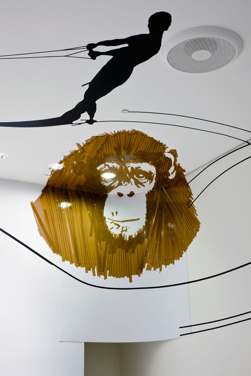 Hess’s site-specific tape drawing 51 Views of Mount Matterhorn (2001), which is ironically titled after Katsushika Hokusai’s Thirty-six Views of Mount Fuji (ca. 1826), was commissioned by, as well as installed at, the Dow Chemical European Headquarters in Switzerland. As with most of Hess’s artwork, the drawing-installation makes an assemblage of various corporate logos (AT&T’s globe, Lufthansa’s crane, Dow’s logo, and others) that are globally connected, and the logos emerge from various lines that at one point form a Mondrianesque tape drawing that obliterates any hierarchy between so-called fine and commercial art. It is ironic that Hess deploys the logos of other corporations for his sitespecific tape drawing for the headquarters of a company that is emblematic of not only the rise but also the reign of multinational corporations in our late capitalist era, which now, in 2009, faces a global collapse.
