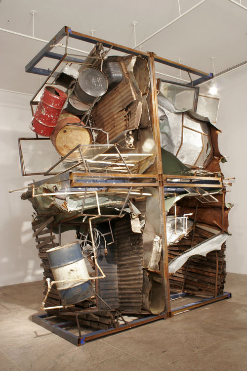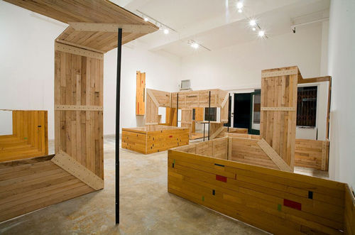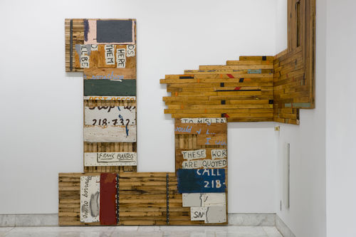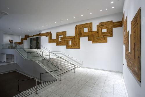 Brooklyn-based artist Rob Fischer salvages material from abandoned buildings and junkyards and reconfigures them into large-scale sculptural environments that weave past histories into the present. For the Hammer's Lobby Wall, Fischer used recycled wooden floorboards from the gymnasium of a derelict school in southern Minnesota to create a labyrinth-like mural that winds around sculptures made of hand-painted and screen-printed signs and panes of glass. Inspired by the American mythology of the road trip, rooted in notions of freedom and self-discovery, as well as the thousands of miles of interstate highways that connect our cities and small towns,the overlapping and intersecting floorboards are like a map of a fantastical roadway.