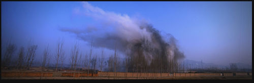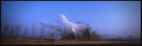 In Skyscraper, Qingsong employed 30 scaffolding workers from the countryside near Beijing during a month long production, to build a 35meter high ‘skyscraper’ out of gold-painted iron scaffolding. Using stop-action 35mm film he captures the entire process, but without showing the workers. China has been growing at breakneck speed but what is not always noticed, like Wang’s process behind his photos, is the immediate effect and sacrifices of millions of displaced and anonymous people. The end of the film shows fireworks exploding from the top of the skyscraper in a jubilant but dark celebration as we listen to three women sing a Chinese version of “Silent Night, Holy Night.”