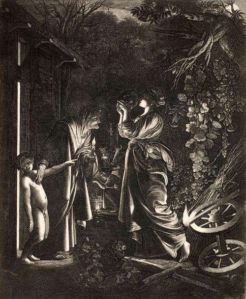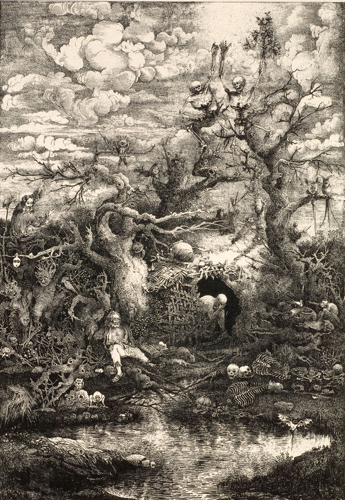 La comédie de la mort (1854), a lithograph by Rodolphe Bresdin, bridges the nineteenth-century gap between the scientific revolution and those romantic artists who thematically rejuvenated mysteries of death and afterlife, especially the French decadents, the symbolists (Bresdin was Odilon Redon’s art instructor), and later the surrealists. J. K. Huysmans, in À rebours (Against the Grain, 1884), applauded this macabre landscape, which also inspired Théophile Gautier’s novel of the same title. Made concurrently were Francisco de Goya’s politically satirical Caprichos, four of which are included in this exhibition.