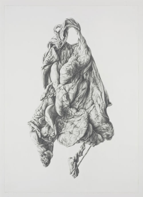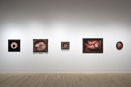 Victoria Reynolds creates rich, highly detailed portraits and pictures of raw meat. She paints pictures of venison, bacon strips, tripe, and reindeer meat in bold strokes, often encasing the paintings in elaborate rococo frames, which give the meat an almost regal quality. The sinewy tissues and tendrils resemble gems, pearls, and blossoms both seductive and repulsive.