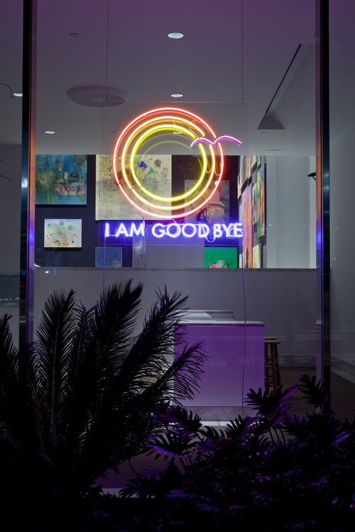 Kunath’s ongoing investigation into the nature of identity seems to encompass centuries of philosophical debate and visual art—from metaphysics to German romanticism, from existentialism to painterly abstraction, from postmodern schizophrenia to gender politics—while remaining somehow cheekily skeptical of all efforts to pinpoint the myriad cultural influences and natural inclinations that inform our senses of who we are. We can locate a range of references to visual artists in his prolific output—the washy pours of paint recall color-field painters such as Morris Louis; the self-deprecating but endearing humor shares a sensibility with David Shrigley and others of his generation; and the concern with the vulnerability of man when faced with the vastness of the world brings to mind the inventive Dutch conceptualist Bas Jan Ader—but Kunath’s work takes up broad questions about the role of the artist in society more than it explicitly addresses any specific precedent. The freestanding painting located on the lobby landing, melancholically titled If the phone don’t ring, you’ll know it’s me (2007), could be a metaphor for the artist. As the artist works, he gradually paints himself out of the picture. The work becomes less about him and more abstracted, and in the process, it takes on the potentiality of resonating more broadly. Kunath’s men are appealing to us in part because they are nonspecific. They could be anyone: your father, your grandfather, your brother, your boss, your best friend. They could be you . . . and perhaps that is why we feel we know them so well. One of the sculptures on view features the phrase “I am goodbye” (borrowed from a Will Oldham song) captured in neon, suggesting that the end (even a temporary ending) of an emphasis on the subjective opens up lots of space. Good-bye to one means hello to another.