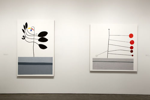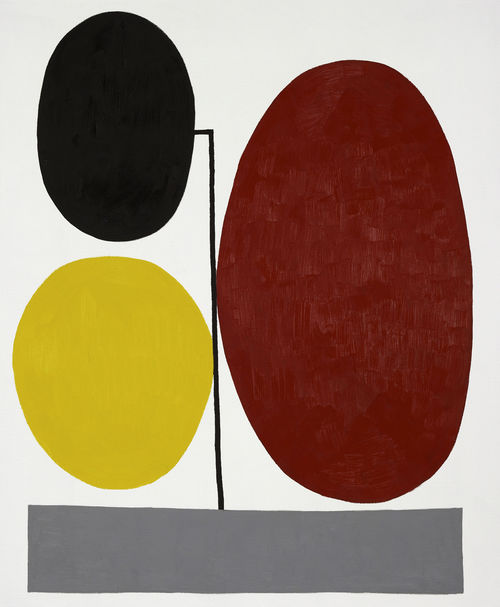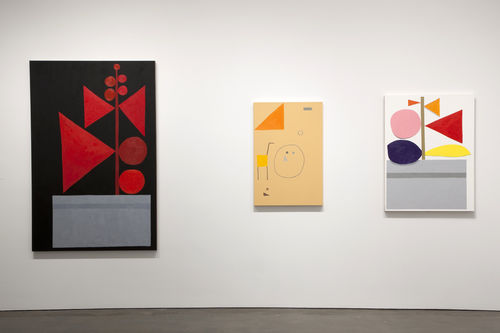Each of the New Plants paintings features a rectilinear form at the bottom of the canvas from which branching lines and geometric shapes reach upward and out. Rendered in vivid palettes against monochromatic backgrounds, the forms resemble both Wood’s depictions of potted plants and abstract sculptures atop plinths. Alexander Calder’s lively geometric sculptures directly influenced Wood during the inception of the series. Though three-dimensional, Calder’s work has an alluring, somewhat ironic flatness that allows the sculptures to appear like free-floating drawings in space. Like Wood, Calder resisted perspective in many of his works, creating the illusion of flatness in three dimensions. Wood’s use of color, compositional arrangements, and subject matter bring to mind Henri Matisse’s genre paintings. In New Plants, Matisse’s influence is also evident in Wood’s use of fields of color to describe forms, a technique akin to some of the French artist’s later paintings as well as his boldly colored gouache-on-paper collages. The strategy is also reminiscent of Milton Avery’s quiet genre scenes, which are characterized by simplified forms articulated through eccentrically colored shapes and lines that are just as often etched into the layers of paint as they are drawn. For Wood, as for Avery, brushwork is an integral part of the visual experience of his paintings. The visible evidence of the short, straight brushstrokes adds heft to the forms while avoiding modeling. This method reinforces the flatness of both the painting’s surface and the picture plane. Like enlarged versions of his paintings within paintings, the more abstract works in New Plants combine Wood’s interest in painting from direct experience with his fascination with the many forms and genres found throughout art history, deepening and extending his investigation of the language of painting.