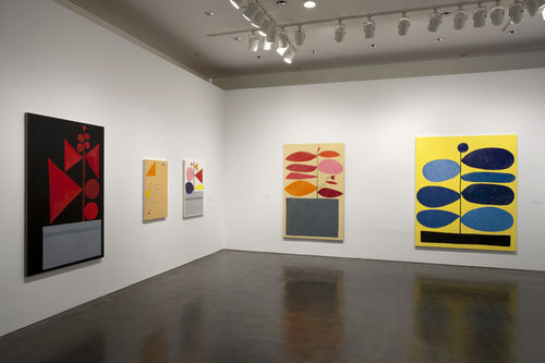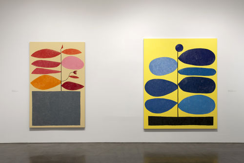 Plants feature prominently in Wood’s interiors and still lifes. Potted plants and cut flora provide ballast to the compositions while adding liveliness and color. Terra-cotta pots; ceramic vessels made by Wood’s wife, Shio Kusaka; and ancient Greek vases sketched during his frequent visits to New York’s Metropolitan Museum of Art appear in paintings with bright green foliage sprouting from their mouths. Begun in 2009, the series on view on this exhibition—informally titled New Plants—is perhaps most obviously related to Wood’s still lifes, yet these more abstract compositions also have a kinship with the paintings within paintings that turn up in his interiors. These small-scale background elements—which pay homage to the history of painting as well as to Wood’s personal history (both of his maternal grandparents were hobbyist painters and collected works by Francis Bacon, Roy Lichtenstein, Robert Motherwell, and Robert Rauschenberg, among other artists)—are writ large in New Plants.