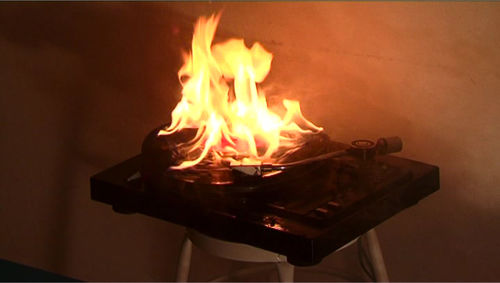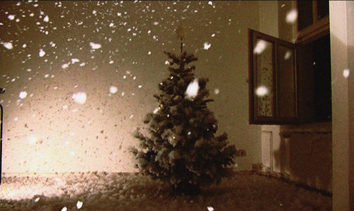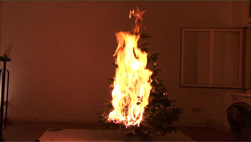 In her film Four Seasons (2009), Cytter takes a more spectacular approach to the Hollywood thriller or film noir genre while also playfully employing tropes of kitschy soap operas and lo-fi special effects. She briefly returns to Antonioni in the opening scene as the dramatic piano score by Ferrante and Teicher plays from a spinning turntable, just as Herbie Hancock’s music was played on a record by the fashion photographer in Blow-Up. The absurdist story line and stilted and repeated dialogue speak to Cytter’s interest in the avant-garde dramaturgy of Bertolt Brecht and Samuel Beckett. The story revolves around a woman entering her neighbor’s apartment in order to ask him to turn down the music only to find him bleeding in the bathtub, the apparent suicide attempt inspired by Roman Polanski’s 1976 film The Tenant. As in Polanski’s film, the architecture plays as vital a role as the characters, and periodically a voice-over reads a text, written by Cytter and influenced by Jorge Luis Borges’s “The Immortal,” describing labyrinthine architecture. The two characters embark on a strange relationship, caught somewhere between genuine attraction and utter confusion. He continually refers to her as “Stella,” perhaps after the troubled centerpiece of Tennessee Williams’s A Streetcar Named Desire—another visitor who comes uninvited and then changes the course of the lives around her—and she continually tells him that her name is Lucy. The deadpan delivery of the untrained actors adds to the realism, making us constantly aware of the viewing process and the multiple facets that make up such a project—the script, the story line, the sets, the costumes, the editing—and disallowing the type of suspension of disbelief that often figures into the dreamscape of cinema. The film climaxes with a kitchen-table celebration featuring an abundance of cake and wine that devolves into chaos when the wine turns to blood, the house fills with smoke, and the man appears to ignite the objects around him—the cake, the turntable, a Christmas tree—using pyrokinetic powers, like a character out of Stephen King’s Firestarter.