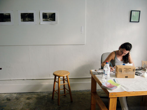 A very big part of this was realizing that I really had no control, and the whole thing about a print shop is that you are in control. But on the road I’m etching plates on bathroom floors and using whatever is around. It’s about working without a net, on the fly, and realizing, too, that by putting myself in the artist’s studio I am deferring to them aesthetically.