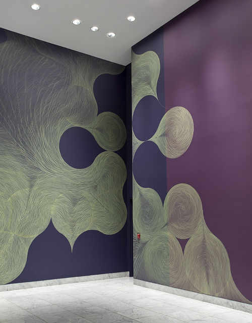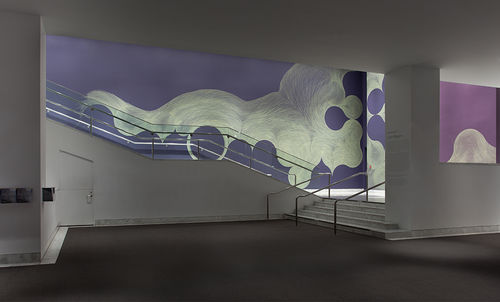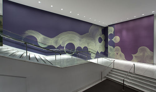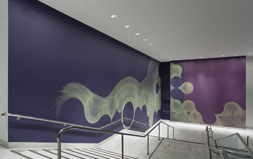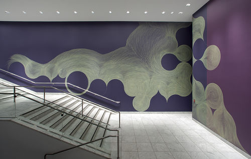 For her Hammer Project, Meyers has created a composition that responds directly to the architecture of the lobby stairwell. Approaching the two adjacent walls as a connected space for one drawing while simultaneously addressing the gap between them, she has created compositions that mirror each other to some degree. The downward slope of the staircase provokes a feeling of tumbling, the circular forms appearing to gradually slide toward the bottom corner. Gathering at the landing and bumping up against the negative space of the gap between the walls, the composition is then picked up and continues on the soaring east wall. In the past, Meyers’s approach to color has been highly intuitive, informed in large part by her formal investigations into the interactions of a relatively contained palette. Each work is generally limited to only two or three colors, with one serving as the background and another for the line work. In selecting the colors for her work at the Hammer—titled Every now. And again.—Meyers has gone in a new direction whereby she extends the notion of site-specificity beyond the architecture of the space to encompass the city itself. Taking note of the colors that characterize Los Angeles, she was drawn to the particular hues of the sky as the sun falls below the horizon. Two shades of a dusky purple—one warm and one cool—provide the background for an elaborate wall drawing in pale yellow ink. Creating the work in a city with a deep connection to the landscape and installing it in a space in which daylight spills through the lobby windows, Meyers recognizes that color is an intrinsic part of the lifestyle here. More than a formal exploration of color, composition, and space, Every now. And again. resonates with our everyday experiences of our surroundings. It captures the light and color of Los Angeles and offers it back to us in a form that is at once direct and contemplative, immediate and suggestive of the passage of time.