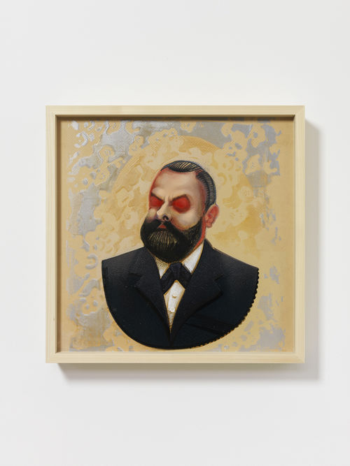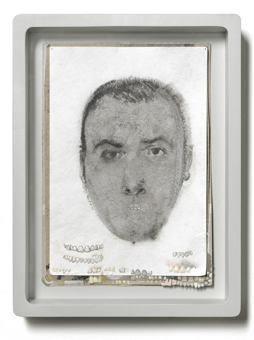 One drawing, set into a deep gray box frame, features a young existentialist type, a phony sophisticate with a speech bubble that says, “zeige deine Wunde.” The phrase has a double meaning. It is the title of a Joseph Beuys installation from 1974–75 and literally translates as “show your wound.” If you look carefully, however, you can see an R after Wunde, and the phrase becomes “zeige deine Wunder,” which the artist interprets as “show me, oh Lord, your revelation.” Another drawing, softly rendered in graphite, depicts the boy who never left his mama—sweet, obedient, and innocent. In another we see a bald, goateed man with a stern expression on his face, and yet another portrays a face with only five small teeth and no mouth, with rows of teeth collaged to the bottom of the paper. There is one triptych with three variations of a goateed figure, again recalling gang portraits, and a diptych painted on round plates, much like ancient Roman coins. Seen together, these portraits form a family album of Dr. Frankenstein’s unborn creations.