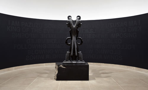 Since he produced the massive version, Cuoghi has considered making one on a smaller scale. He finally decided to produce a five-foot-high double Pazuzu, carved out of black Carrara marble. Standing firmly on a simple marble base, with a ring atop each head (so that the amulet can be hung over a child’s crib), the two bodies, placed back to back, intertwine like an X, becoming one. The double demon perches in the center of the Hammer’s Vault Gallery, watching over and protecting the ghosts of Cuoghi’s alternative identities.