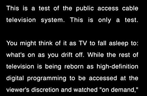 Completely decontextualized, the audio tests encourage both flights of fancy and earnest rumination. Randomly sequenced and infinitely varied, the unceasing “music” is strangely haunting. Raven’s exploration of the materials of cinema in transition engages questions about how we perceive and how media constructs our perception. When the recommended practices for projecting analog and digital cinema are followed, movies look and sound the same across theaters. In this sense, these test loops are deeply influential, dictating a particular aesthetic that we as audiences come to accept as our image of the world.