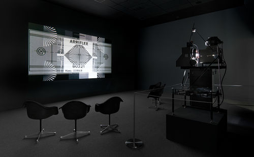 In Raven’s new works, the test patterns are no longer merely functional and subservient to the feature film but are now the focus of attention. RP31 takes this shift one step further. By including the projector and looper in the same space with the projection, Raven highlights the apparatus for which the test patterns are made. Large and noisy, the 35mm projector stands in stark contrast to compact, quiet digital projectors. Its physical presence calls attention to its near obsolescence. In 29Hz, in contrast, Raven gives us untethered audio.