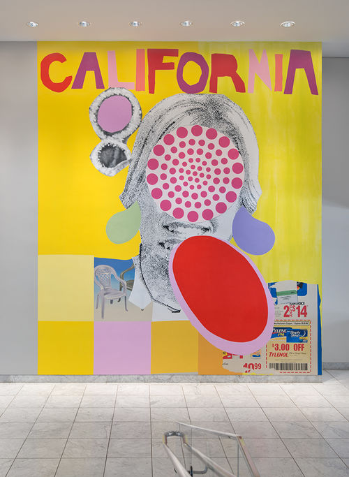 With levity and wit, Meg Cranston investigates the intersections between individual and shared experience and how imagery and objects acquire meaning in our culture. Equally enamored of the diverse aesthetics of color theory, design, fashion, and supermarket advertising, she makes energetic collages pairing found imagery with monochromatic abstract forms. While often taking personal attributes or historical events as a jumping-off point, Cranston’s work is equally concerned with the formal language of art and the role the artist plays in helping us see the world in new ways. An iconic blonde California girl greets visitors from the east wall in California (Full Size) (2012). A playful nod to the notion of the artist as seer or mystic, Fireplace 12 (2012), on the north wall, borrows its colors from a spring–summer 2012 color forecast for fashion and home design. Symbols of the fire that they produce, the larger-than-life lighters conjure everything from rock concerts to religious rituals. Commissioned for Made in L.A. 2012, the museum’s inaugural biennial of work by Los Angeles–based artists, the murals reflect Cranston’s interest in weaving together formal experimentation with recognizable cultural references, a strategy that she shares with many other artists in our city.
