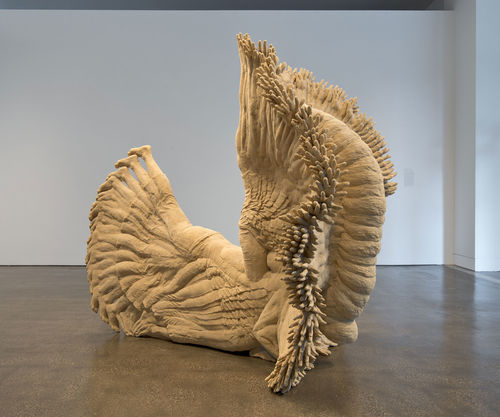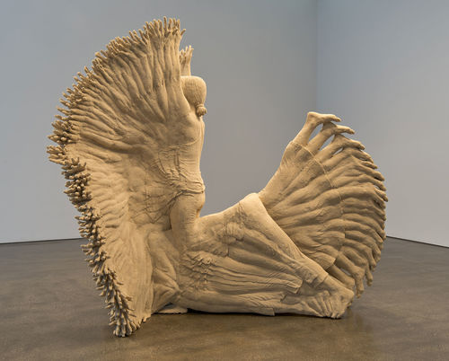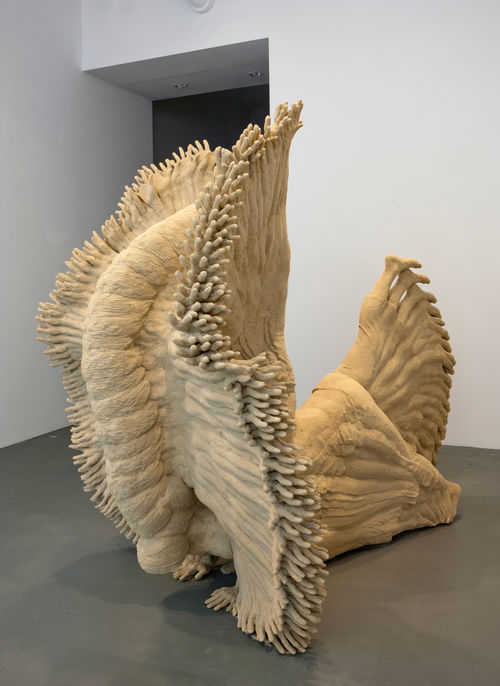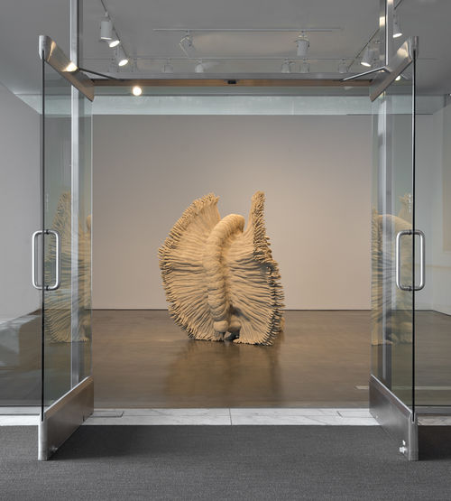 Katie Grinnan uses sculpture, photography, sound, and video to explore the relationship between our visual and kinesthetic experience and our resulting interpretation of space. To make Mirage, Grinnan cast multiple molds of her body executing a sun salutation, a sequence of hatha yoga postures, or asanas, that are typically repeated in a rising and falling, undulating motion. Resembling a multiarmed Hindu deity, Mirage describes the full extent of the body’s peripersonal space. Dependent upon context, the space within our personal boundaries is constantly changing, directly impacting our perception of reality. This subjective experience of space and time is at the core of Mirage: the work translates a specific movement into a static object, compressing linear time in a manner that recalls the principle of quantum superposition, which holds that a physical system exists in all its possible states simultaneously but can be observed in only one state at a time.