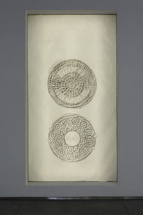 While working in Los Angeles, Gaillard identified further evidence of colliding times and cultures on the city’s streets: the manhole covers. He noticed that these industrial lids not only share motifs and patterns with pre-Columbian art but also bear texts that give them another layer of disorentiation. The legend “City of Los Angeles” is often followed by “Made in India” in equally prominent type. Gaillard took it upon himself to record these undercover monuments, employing an ancient mode of recording—frottage. The intrepid artist ran into the streets to obtain rubbings of the manhole covers, creating his own indexes of a specific time and place. The rubbings recall Olmec images of heads and mythical creatures. Gaillard calls the series Gates, which emphasizes the manhole covers’ function as barriers or gateways: in real life, they may lead only to the city’s sewer system, but in movies and fiction they often serve as portals to an underworld or as secret passages to the other side of the world.