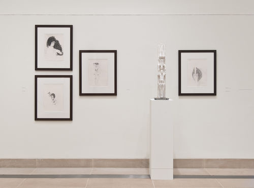 Transient figures and intangible forms dwell in the work of Enrico David. They retain a graphic quality as they transition from spontaneous sketches on paper to paintings, sculptures, and works in other mediums. This exhibition, David’s first solo presentation in Los Angeles, takes its cue from a singular figure modeled in bronze around a hollow animal bone and bound to a protruding blade. The statuette is like an anthropomorphic pocketknife that embodies both permanence, through its molded outlines, and ephemerality, through its gaping cavity. Around it, paper mummies crawl across the wall of the gallery, a haunting silhouette peers out of a large canvas, and ethereal profiles form a see-through metal screen. The infinite shifts and vortexes of David’s underworld are evoked in the streaming lines of his drawings and the repetitive loops of a handcrafted tapestry. Experienced together, the works in this exhibition evoke the continuous metamorphosis of body and soul. Groundless images and vacuous gazes exude a sense of unease in the visitor, who is at once observer and participant in a staged scene. Its components recall the miscellaneous displays of regional arts and crafts museums, but they could also be props for a Surrealist set. Hammer Projects: Enrico David is organized by Allegra Pesenti, curator, Grunwald Center for the Graphic Arts.