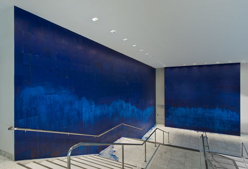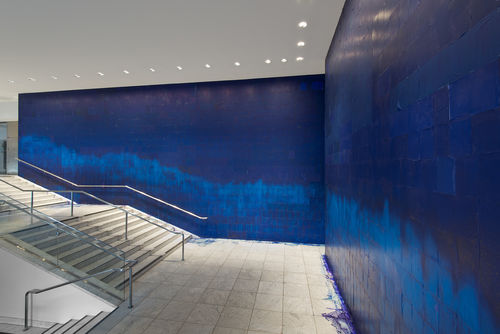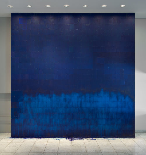 For her Hammer Project, Latifa Echakhch will reprise her 2007 work À chaque stencil une revolution (For each stencil a revolution) for the Hammer’s lobby wall. After attaching hundreds of sheets of carbon paper to the wall, Echakhch will treat the surface with a solvent that causes the ink to run down the pages and pool on the floor. Her use of carbon paper points to an outmoded duplication technology that was central to the ability of political groups of earlier generations—such as the civil rights and anti–Vietnam War protests of the 1960s—to disseminate information and opinions. The title of the work is a quotation from the Palestinian leader Yasser Arafat who was referring to the proliferation of revolutionary groups and protest movements. While the work pays homage to the uprisings of that period, it rings with melancholy: stripped of its ink, the paper is robbed of its potential to carry any message. Referring as well to both abstract expressionism and the signature blue of Yves Klein, the work asks us to reconsider the relationship of abstract art to politics.