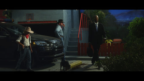 Building on these techniques of storytelling and framing, Beloufa employs the tropes of Hollywood films in Production Value (2013), the new work for his exhibition at the Hammer Museum. This video follows teenagers, gangsters, cowboys, Marxists, and hippies, all united by their use of the red bandanna, a uniquely American symbol in the mind of the French artist. These groups converge at one climactic event and then have to find a way of moving forward in the aftermath. Production Value was filmed in Los Angeles during Beloufa’s residency at the Hammer, and the proximity to Hollywood had increasing influence on its development, so that the bandanna became a visual unifier instead of the focus of the film. The work plays on the conventions of teen and action ensemble movies: the same story told from multiple perspectives, the action confined to a short time span, the buildup toward a climactic event followed by the morning after. At the length of a feature film, it is the most linear narrative that the artist has produced to date.