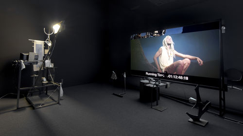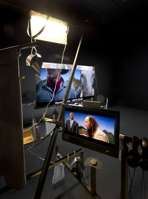 With Production Value, Neïl Beloufa asks viewers to question the narratives presented by revealing the apparatus of the work’s production. Like filmgoers, museum visitors tend to suspend their disbelief when entering the gallery, but the artist confronts them with the tools of fabrication so that they must consider the film as a composition of various parts rather than a seamless whole. We question his choices as an artist and his purpose in making such choices. It is similar to the way in which a visitor looks at a sculpture or a painting, attempting to understand the techniques involved. Beloufa provides keys to these answers so that they are pulled into the middle ground that he creates between the cinema and the art gallery, where speculation and imagination are as valid as truth and observation.