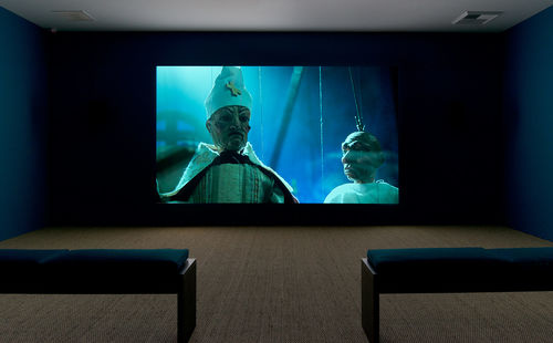 Working closely with Cittadellarte–Fondazione Pistoletto in Biella, Italy, Shawky was able to secure the loan of more than 120 two-hundred-year-old marionettes from the Lupi collection in Turin, Italy. The artist made period-specific costumes for the marionettes, built intricate realistic sets, created a score, and wrote a script in Arabic that narrates these early pivotal years of the conflict. The result is a half-hour film that takes viewers across the various places in Europe and the Middle East that set the stage for the beginning of the Christian holy war. The marionettes, molded with ceramic heads and limbs, take on the roles of various historical figures as well as everyday persons. Unlike characters portrayed by actors, who often project their own personalities onto a scripted role, the characters in Shawky’s film appear distant and timeless at once, reinforcing the artist’s attempts to prevent individual perspectives and opinions from dominating the telling of this tragic story. As the marionettes move across the screen, the strings that connect them to the puppeteers create a complex web that poetically visualizes the systems of manipulation and control that are so poignantly embedded in the events that unfold in each subsequent shot. Rather than presenting the films as isolated projections, Shawky carefully constructs installation environments for them, drawing attention to history’s relationship to the staged and the theatrical.