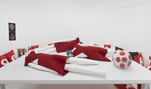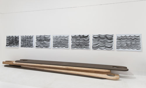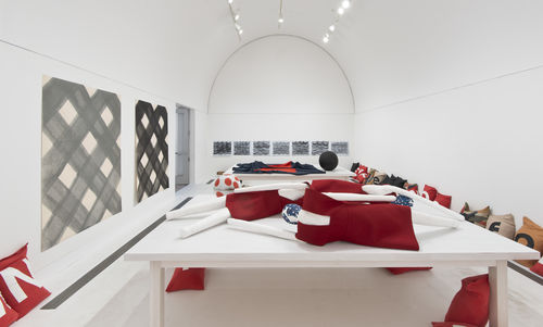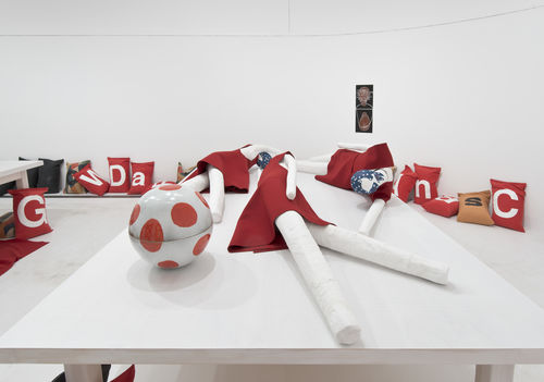 The different mediums and materials used to create the objects on view reflect Nipper’s long-standing interest in craft movements. There are carved wooden weaving tools rendered in an absurdly large scale; ceramics in the form of a globe (abstractions of a vast space); textile blankets; plaster figures with long articulated necks and torsos adorned with felted costumes; appliquéd sandbags; and drawings of patterns that reflect a grammar of the body’s motion. These patterns are drawn from the artist’s ongoing exploration of the influential movement theories of Hungarian dancer and choreographer Rudolf Laban, who figured prominently in the development of modern dance in the first half of the twentieth century. As part of the exhibition, a series of performances will take place in the gallery. Featuring the dancer Marissa Ruazol, these performances are rooted in a system called Laban Movement Analysis. Laban's method provides a vocabulary and a conceptual framework for investigating and considering time, space, and motion as primary materials. It describes and analyzes the movement of the body through space and can be understood more broadly as illuminating modes of communication. For Nipper, these fundamental bodily movements are thus importantly linked to language and technology, suggesting the ways in which technological innovations—from timekeepers like the clock to photography–measure, shape, and indeed expand our sense of time and space.