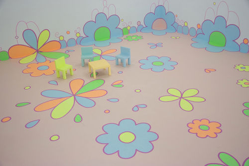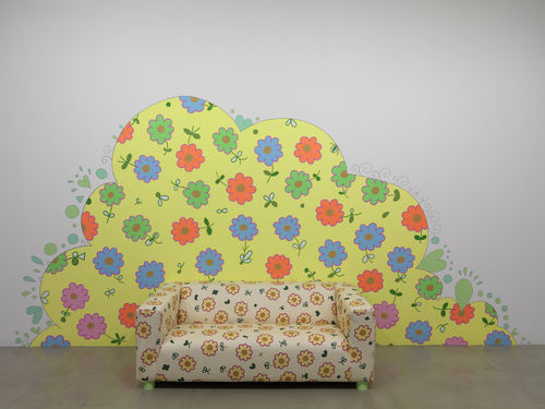 Since the late 1980s the Dutch artist Lily van der Stokker has been making large-scale wall paintings that unashamedly and exuberantly bring just such “inappropriate” topics into the public realm of art, often combining short, aphoristic texts with colorful, cheerful, soft forms and repeated patterns. Van der Stokker is fully committed to the liberating potential of integrating “high” art with commonplace and familiar aspects of our private lives. It was a radical gesture for her to carve out this niche for herself at a time when many women artists in the United States were adopting strategies of appropriation, producing works that were critical yet often cool in tone and intellectually rigorous, and when popinfluenced painting rooted in graphic languages and bright colors was typically associated with male painters like Keith Haring and Jean-Michel Basquiat.