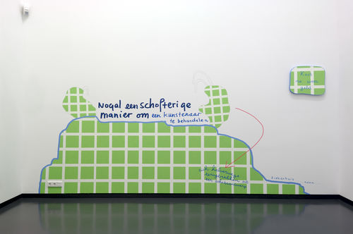The duality articulated by Van der Stokker as “approachable and controversial” speaks to the core of what gives her work its tension, its energy, and ultimately its transgressiveness. Her incessant curlicues, cute flowers, and undeniably beguiling patterns, rendered in pastels and fluorescents that many would find cloying and vulgar, are at once totally sincere—she has repeatedly proclaimed her commitment to beauty and happiness—and willfully provocative. Her feminism resides in her awareness that, as she put it, “There’s no such thing as gender-neutral art.”2 And she insists that we recognize these ingrained biases through her bold approach to form and content, producing work that she knows will be judged by some as “girlie” and thus lacking in seriousness, intellect, and rigor. She has not backed down from her commitment to this position and has played the long game, as it were, and over time her aesthetic—often likened by critics to teenage doodles or the “decorative” realm of textile design—has come to feel incredibly radical. Indeed, with her adeptness at luring viewers with captivating (and seemingly innocuous) hand-painted illustrations, humorous texts, and sheer scale and then surprising them with content that is remarkably honest—by turns subversively friendly or bitingly critical and addressing such fraught subjects as power dynamics, social marginalization, and even the machinations of the art world—she has smartly aligned herself with the enduring and boundary-pushing strategies of satire, parody, and caricature. Like others who embrace these strategies, she is refreshingly unafraid to laugh at herself. Yet her work is far from cynical or ironic; on the contrary, she is dedicated to providing immense visual pleasure and communicating with the broadest public possible by touching on subjects and feelings that we have all experienced.