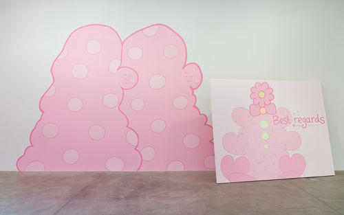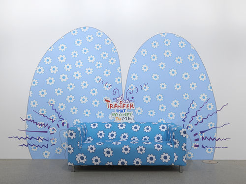 Dutch artist Lily van der Stokker has been making bold, colorful large-scale wall paintings for more than twenty years. The artist applies colors ranging from soft pastels to bright fluorescents—sometimes in playful and visually arresting plaid patterns or all-over flower motifs—to amorphous soft-edged forms that inhabit the space like friendly oversized visitors. Witty texts added alongside van der Stokker’s forms complicate their first impression as the cartoony doodles of an adolescent or mere decorative ornamentation. Invoking the platitudes of polite society with expressions like “Best regards” or “Wonderful” or touching upon the realities that impact all our lives, from love to money to aging, with phrases like “Transfer the money to me” or “Only yelling older women in here, nothing to sell,” van der Stokker makes evident the power dynamics at work within seemingly innocuous spaces. Van der Stokker argues for the role of pleasure in aesthetic experience, finding alliances between beauty and intellect, playfulness and criticality.
