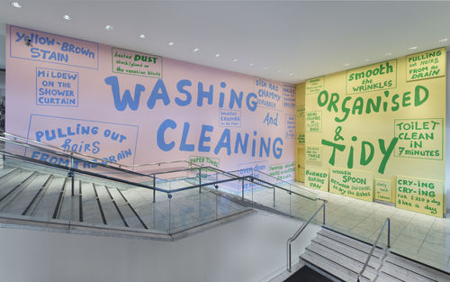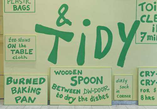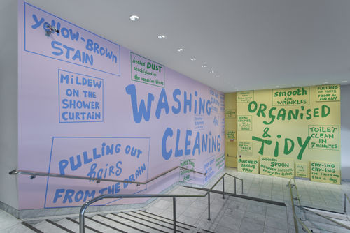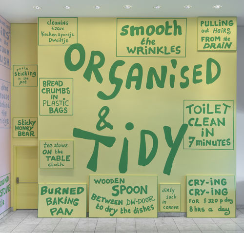 For her exhibition at the Hammer Museum, titled The Tidy Kitchen, Van der Stokker may have created her most political work to date. Eschewing imagery and pattern in favor of a heavily text-based approach, she brings the subject of housework and cleaning into the domain of the museum with an intensity and integrity on par with that of Ukeles, Kelly, and Rosler in the 1970s. The phrases “Washing and Cleaning” and “Organized and Tidy,” writ large across the expansive walls of the museum’s lobby, are surrounded by descriptions of objects and actions from the domestic sphere that are modestly charming or innocuous—“sticky honey bear” and “smooth the wrinkles”—or disgusting—“mildew on the shower curtain” and “dead mouse behind the fridge.” There is a humor to the sort of leveling that comes with an awareness that we all, at one time or another, have to remove hair from our shower drains. But this sense of shared experience is complicated by phrases that are more crassly commercial, like “oven clean in 2 hours 45 minutes,” reminding us of how we are constantly bombarded with ads for products claiming to make our lives easier and better. The space of domestic labor has long trafficked in the unacknowledged and unpaid labor of women, and van der Stokker takes the argument that women should be compensated for their skills and contributions one step further with the text “Crying Crying for $320 p day 8 hours a day,” which proposes women should be paid for expressing their emotions. Labor and gender issues quickly come to the fore, and a contemplation of domestic space extends into a consideration of public space, indeed the site in which visitors find themselves standing. Public institutions like museums, of course, require constant and diligent cleaning and safeguarding, and the efforts of those who maintain the physical integrity of these places often remains invisible and underacknowledged. As Van der Stokker describes it, the work “is almost a political demonstration for housecleaners. For me, it touches upon taboos in the art-world and celebrates domestic life.”3 In this work, we see her exceptional ability to finesse the complexities of her subjects with insight and simplicity. With a calming palette of pink, blue, green, and yellow, Van der Stokker both honors and celebrates cleaning as part of our daily lives and insists that art examine those things that we may prefer to keep hidden from view.