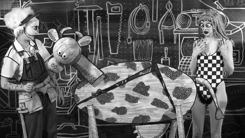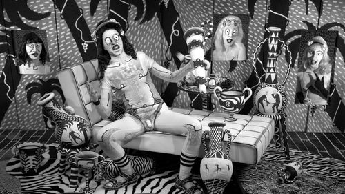 Trained as painter, Mary Reid Kelley creates narrative videos set within her own stylized black and white drawings. Working with videographer Patrick Kelley, her characters—all roles usually played by the artist—move through her black-and-white scenery and speak in poetic verse written by the artist. Beginning with Priapus Agonistes (2013), Reid Kelley explores the Greek myth of the Minotaur, turning the hybrid creature into half woman rather than man. In the second video of this series exploring the Minotaur’s family history, Swinburne’s Pasiphae (2014), Reid Kelley brings to life an unpublished text by the Victorian poet Algernon Charles Swinburne, which is rich with bawdy double entendres and visual language that aligns with the artist’s own writings. The third and final video of the trilogy, The Thong of Dionysus, will be completed in 2015 and will premier in her Hammer Project. A mix of Greek cartoon, slapstick, and multidimensional wordplay, Reid Kelley’s videos explore the roles of women, sexuality, language, and art historical tropes. This exhibition will be the first presentation of the complete video trilogy and will include portraits of her recurring characters in the Hammer’s courtyard lightboxes.