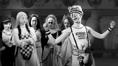 Dionysus takes pity on Ariadne, the legitimate daughter of Pasiphae and Minos and half-sister of the Minotaur. She appears in the first and second videos but is a silent player throughout. She is portrayed as helplessly floating through life. Her mother is an addict and has brought shame on her family. Her sister has been secluded her entire life, and a hero has been dispatched to kill her. Ariadne’s life is filled with hopelessness, and she does not have “raisins” to continue. Dionysus marries Ariadne and then passes out, leaving his maenads to encourage her to accept her “Disco Tent” as a place to live and dance, rejecting the terrible fate and emotional burden of her family.
