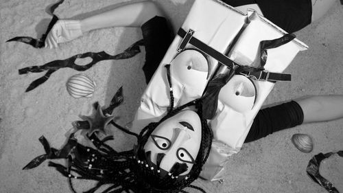 Traditional storytellers have focused on the hero Theseus and his quest to conquer the Minotaur, thereby freeing the people of Athens of their tributary obligations and defeating King Minos, but Reid Kelley’s trilogy centers on the women in the myth: Queen Pasiphae and her daughters Ariadne and the Minotaur (who is male in the traditional telling of the myth). The artist plays every character in these videos before a green screen, and Patrick Kelley composites the characters together over animated scenery based on Reid Kelley’s drawings. She finds or makes all of the costumes and props, creating a very distinctive aesthetic for each video. Reid Kelley was trained as a painter, and her black-and-white videos have a drawing-like quality. They recall illustrations and cartoons, methods of conveying experiences before the advent of the photograph. The worlds presented in these videos through scenery, characters, and dialogue are carefully crafted and complete.
